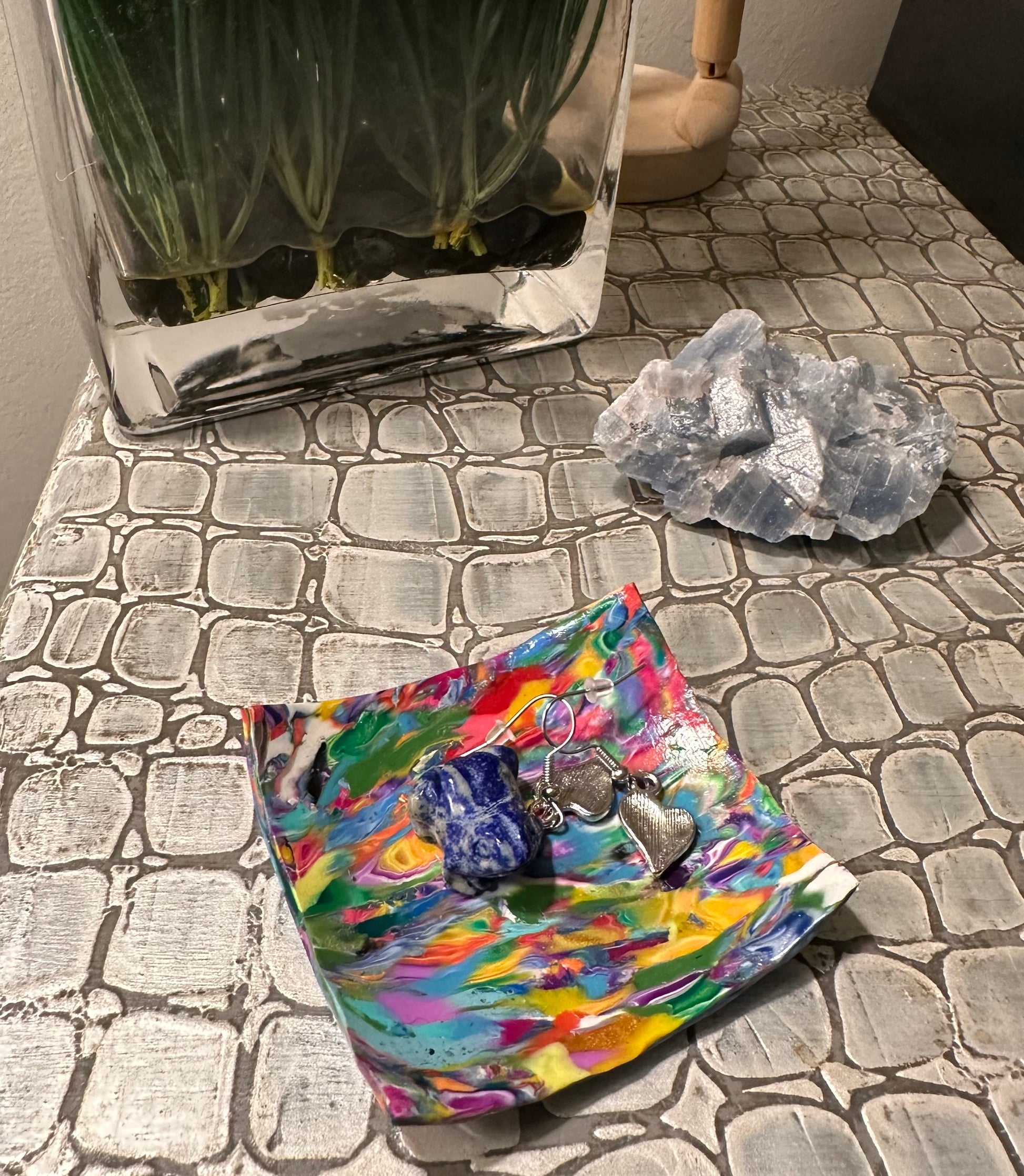 Rainbow, fun, handmade, polymer clay, trinket dishThis handmade trinket dish is crafted from durable polymer clay, creating a unique and versatile storage solution for all your small items. Its one-of-a-kind design showcases all the colors, making it a beautiful addition to any home. Keep your trinkets and jewelry organized and easily accessible with this special dish.
