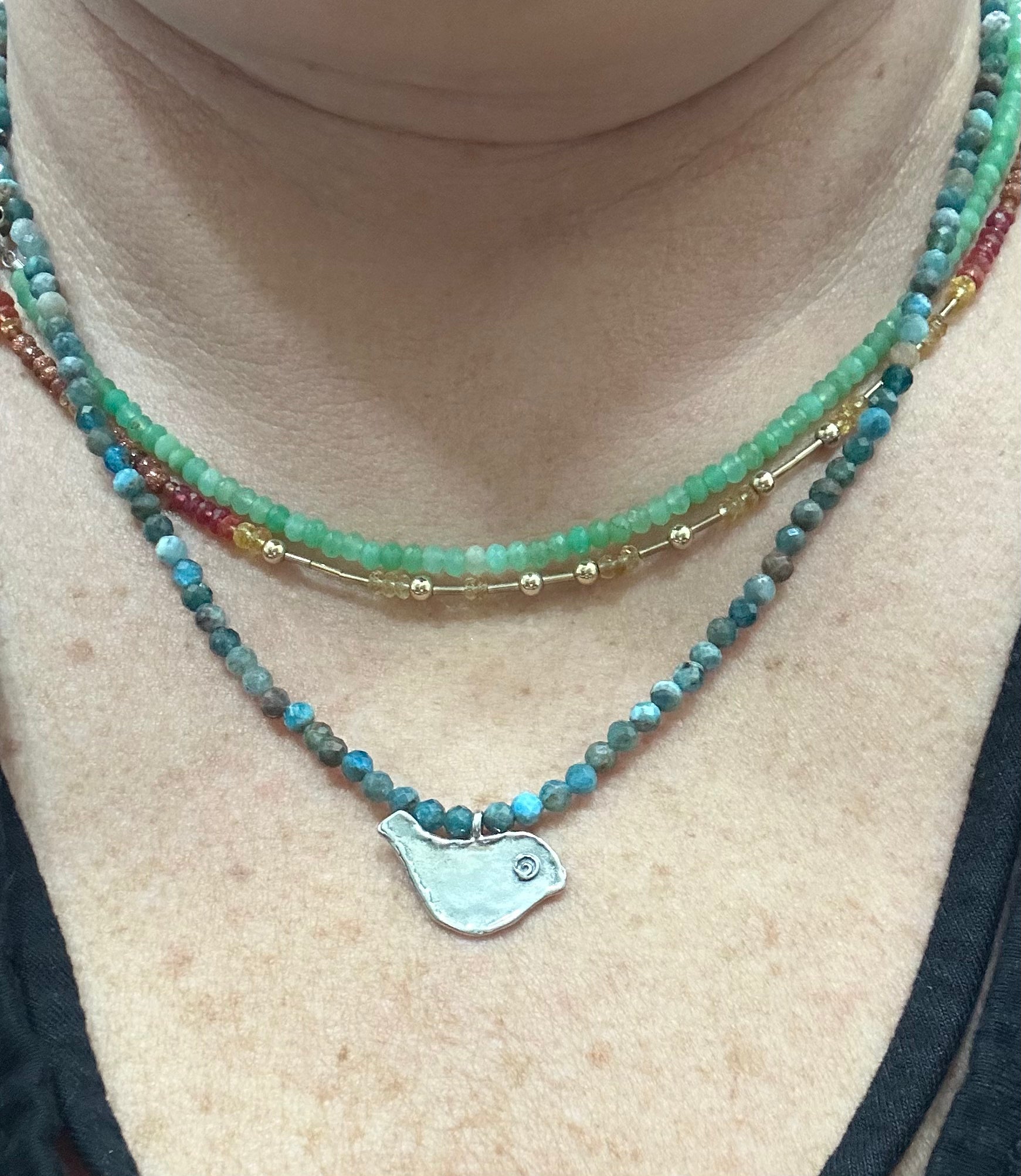 Express yourself with this unique Blue Apatite necklace featuring a charming silver bird pendant. This 20 inch necklace is not only stylish, but also promotes clarity and self expression, thanks to its association with the throat chakra. Let your personality shine with this playful and meaningful accessory!