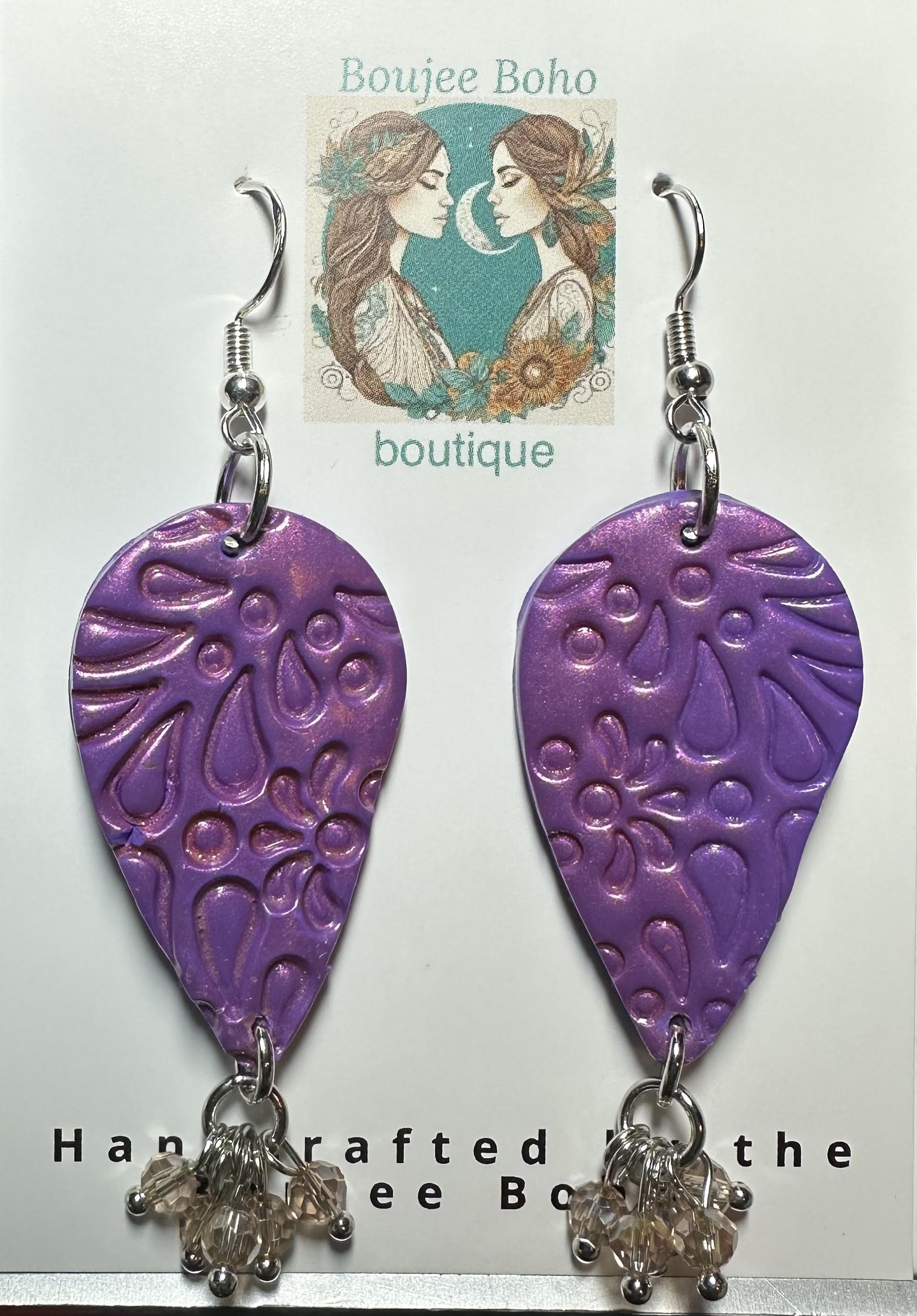 Celebrate the beauty of nature with our Petal Bliss Earrings from Boujee Boho Boutique. These handcrafted earrings feature teardrop-shaped clay pieces in a radiant purple hue, embossed with delicate floral and petal patterns. The shimmering finish enhances the intricate design, while dangling clusters of soft champagne-colored beads add movement and an elegant touch.