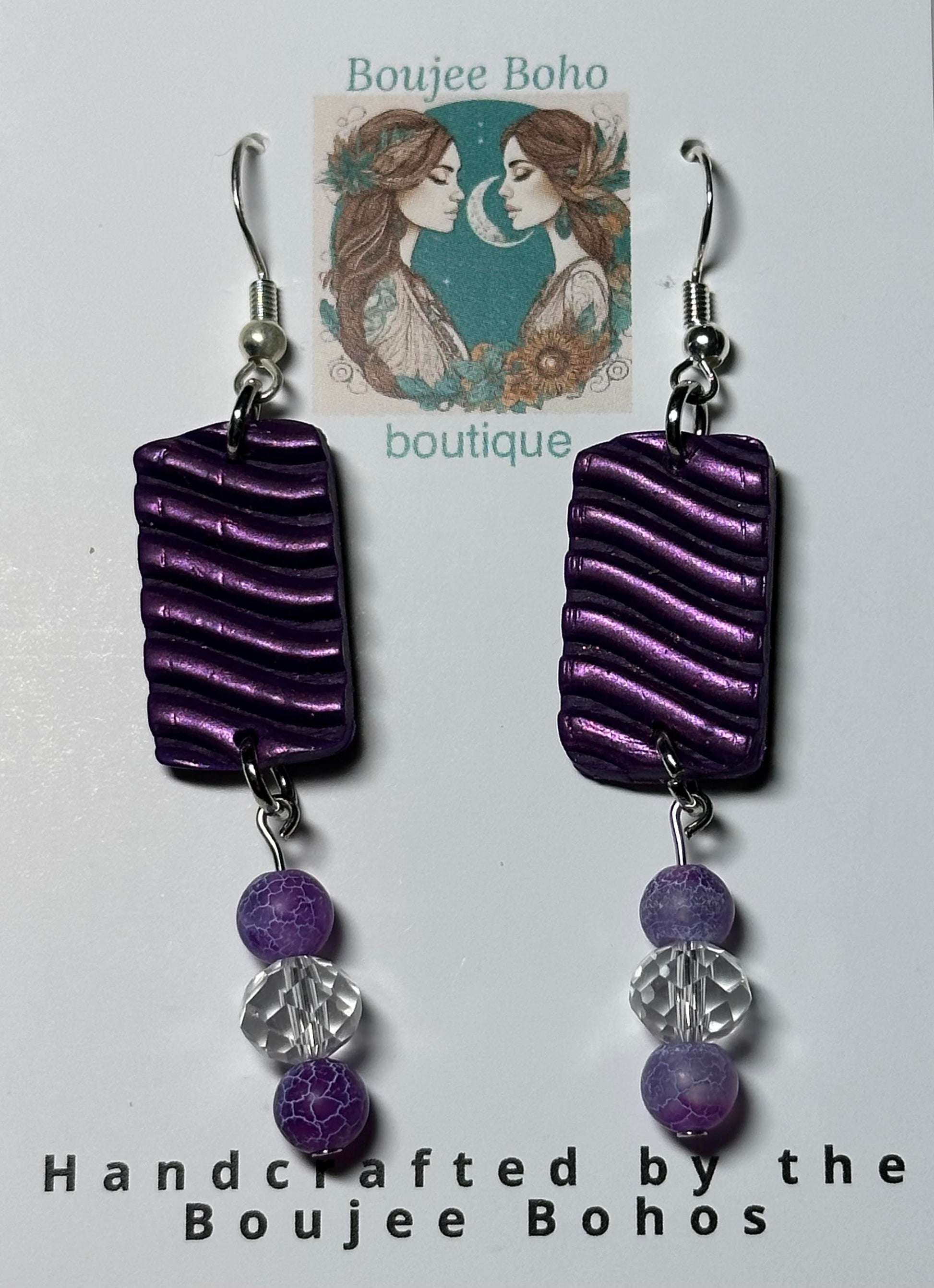 Make a bold statement with our Amethyst Waves Earrings from Boujee Boho Boutique. These handcrafted earrings feature rectangular clay pieces in a rich, metallic purple, embossed with wavy textures that create a mesmerizing, modern design. The elegant dangle is finished with two crackled purple beads and a sparkling clear bead for a touch of sophistication and charm.