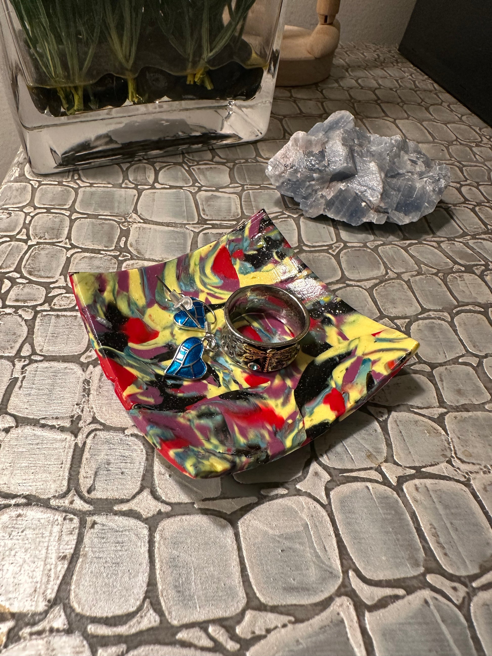 Get ready to add some fun to your home decor with our Festival Trinket Bowl! This handcrafted, unique trinket dish is perfect for holding your favorite knick-knacks. Each one is individually made, making it a one-of-a-kind piece. Say goodbye to boring bowls and hello to a unique and playful touch to your space!