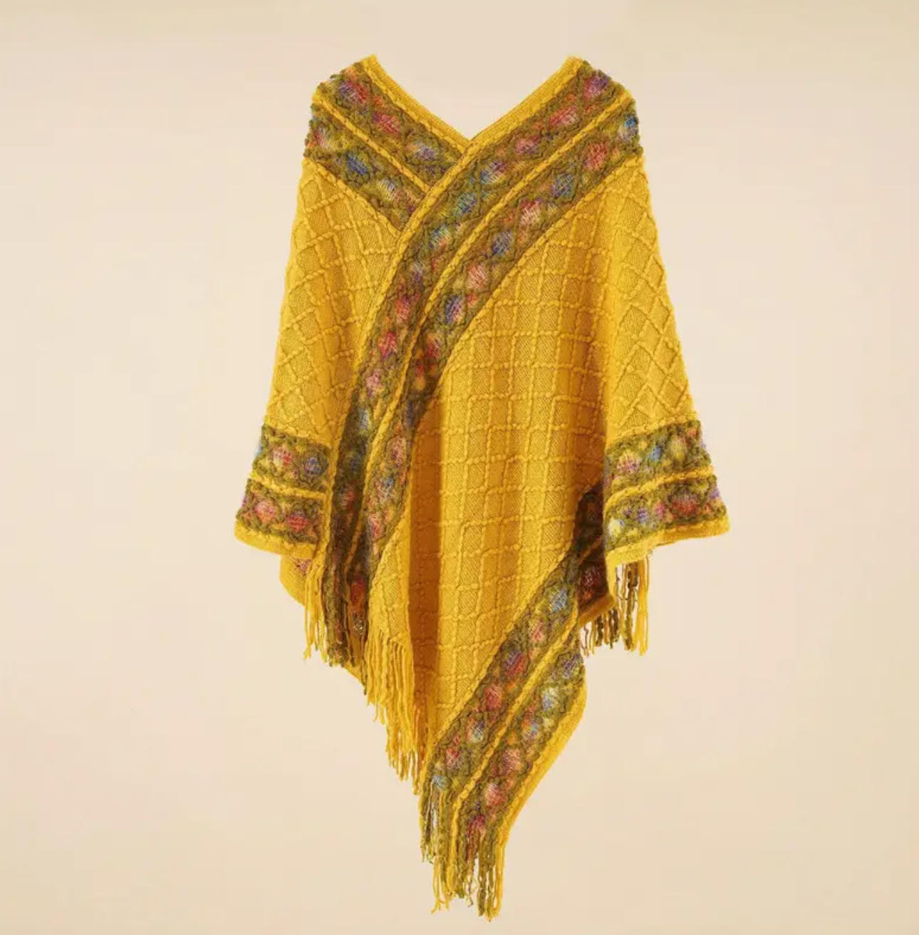 Brighten up your wardrobe with our Golden Sunshine Knit Poncho. Featuring a beautiful quilted texture in a rich mustard yellow, this poncho is adorned with colorful floral-inspired accents along the edges and finished with playful fringe. Its soft, warm knit design makes it the perfect layering piece for crisp days.