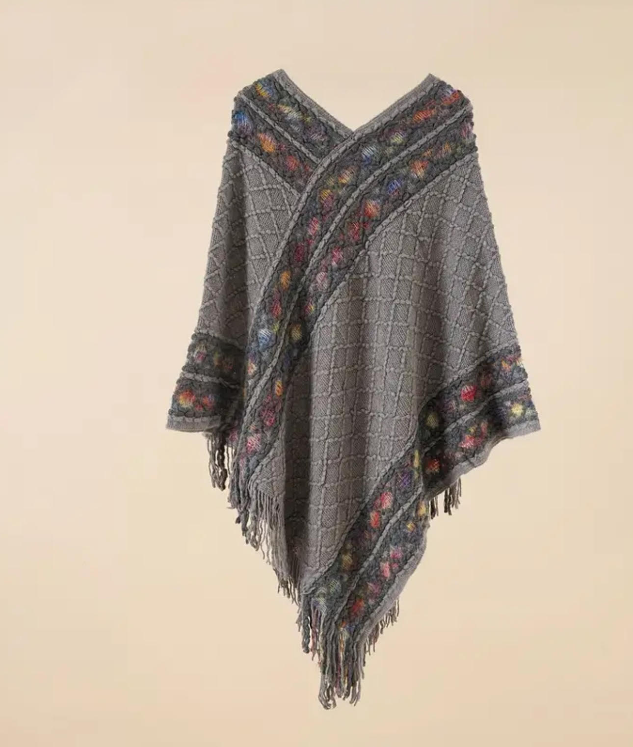 Wrap yourself in comfort and style with our Gray Garden Knit Poncho. Featuring a soft gray quilted texture, this poncho is beautifully accented with colorful floral-inspired borders and a delicate fringe trim, adding an elegant touch to your outfit. Perfect for layering on cool days, this poncho blends practicality with timeless fashion.