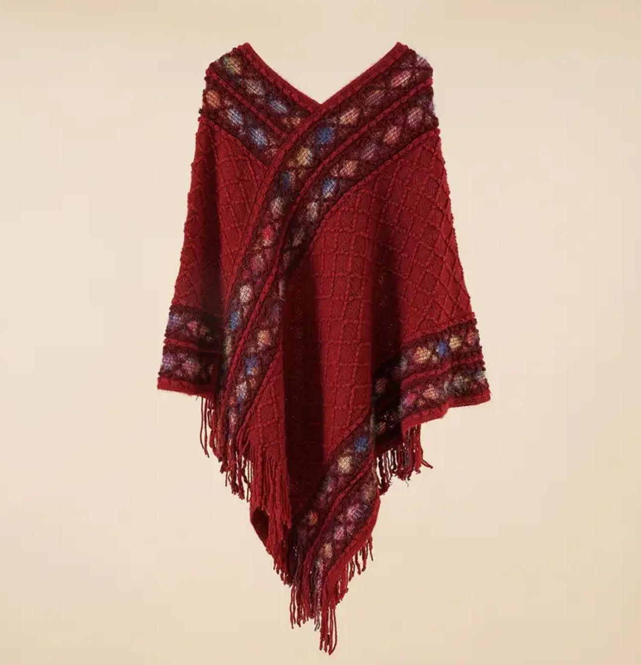 Turn heads with our Crimson Bloom Knit Poncho, a statement piece that blends warmth with bold elegance. This rich red poncho features a textured quilted design, enhanced with colorful floral-inspired borders, and finished with a flowing fringe for a touch of bohemian charm.