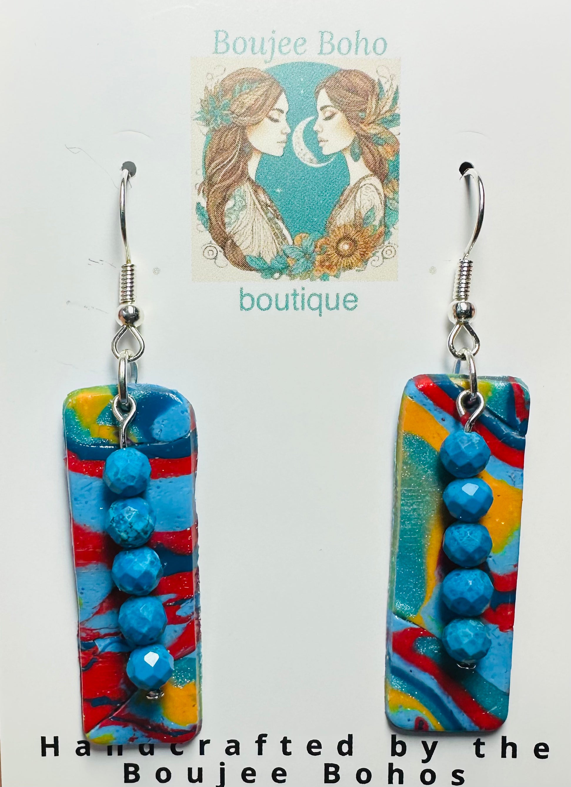 "Add a splash of color and whimsy to your look with our Turquoise Falls Earrings. Handmade with polymer clay and real stones, these lightweight earrings are a playful addition to any outfit. Dive into style with these unique, one-of-a-kind earrings!"